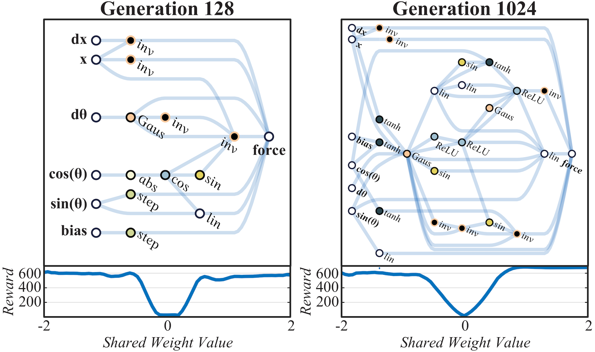 As the search process continues, some of these controllers linger in the upright position longer than others, and by generation 128, the lingering duration is long enough for the pole to be kept balanced. Though this more complicated balancing mechanism is less reliable under variable weights than the swing-up and centering behaviors, the more reliable behaviors ensure that the system recovers and tries again until a balanced state is found. Notably, as these networks encode relationships and rely on tension between systems set against each other, their behavior is consistent with a wide range of shared weight values.