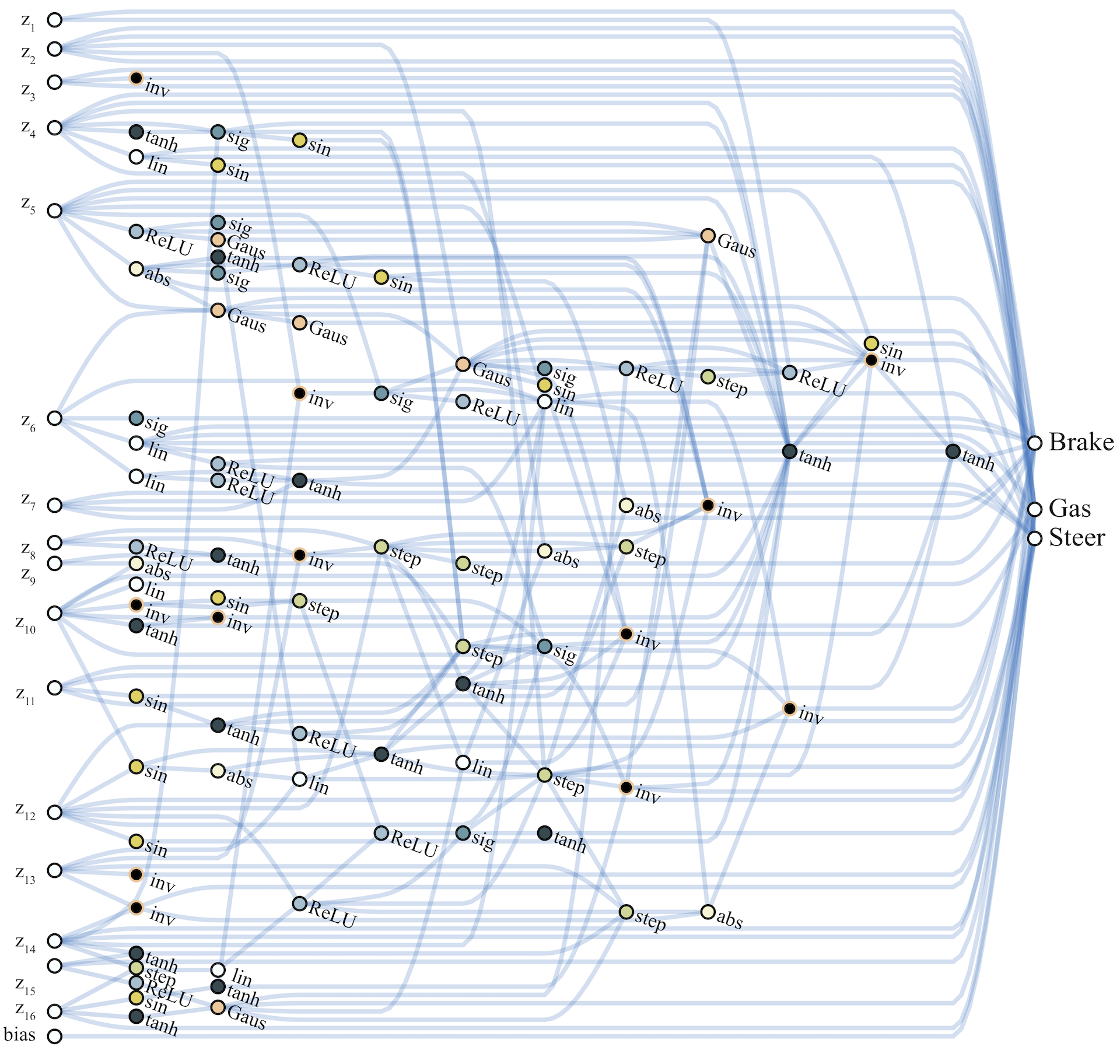 The architecture which encodes stable driving behavior in the car racer is also striking in its simplicity. Only a sparsely connected two layer network (below) and a single weight value is required to encode capable, but imperfect driving behavior.