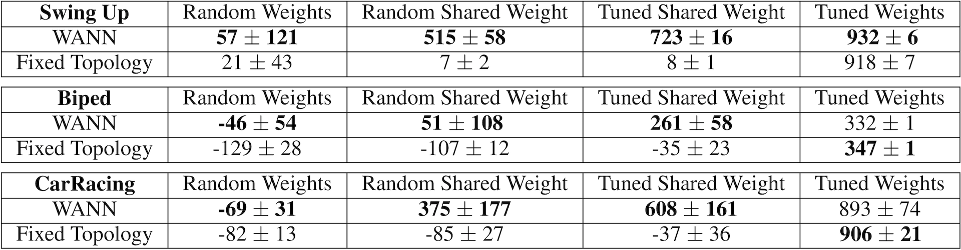 The best performing shared weight value produces satisfactory if not optimal behaviors: a balanced pole after a few swings, effective if inefficient gaits, wild driving behaviour that cuts corners. These basic behaviors are encoded entirely within the architecture of the network. And while WANNs are able to perform without training, this predisposition does not prevent them from reaching similar state-of-the-art performance when the weights are trained.