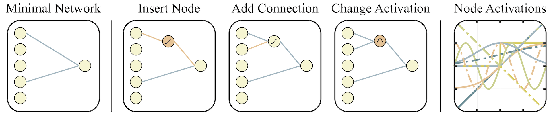 The initial population is composed of sparsely connected networks, networks with no hidden nodes and only a fraction of the possible connections between input and output. New networks are created by modifying existing networks using one of three operators: insert node, add connection, or change activation (See figure above). To insert a node, we split an existing connection into two connections that pass through this new hidden node. The activation function of this new node is randomly assigned. New connections are added between previously unconnected nodes, respecting the feed-forward property of the network. When activation functions of hidden nodes are changed, they are assigned at random. Activation functions include both the common (e.g. linear, sigmoid, ReLU) and more exotic (Gaussian, sinusoid, step), encoding a variety of relationships between inputs and outputs.